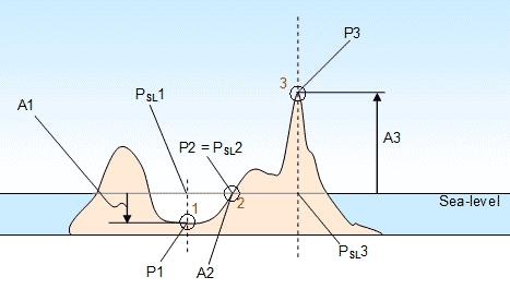 Suppose there are three locations on land that a pressure measurement is taken. Location 1 is below sea-level, location 2 is at sea-level and location 3 is above sea-level. If we know by looking at topographic maps, or other sources, what the absolute altitudes (A1, A2 and A3) of each location are and we measure the actual pressure (absolute atmospheric pressures P1, P2 and P3) at each location, we can calculate what would the pressures at sea-level (PSL1, PSL2 and PSL3) at each location. Below are the values we have: