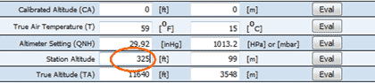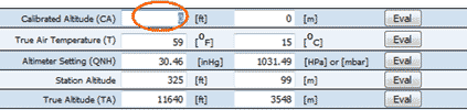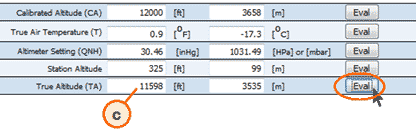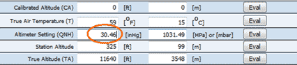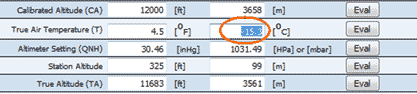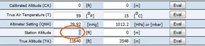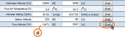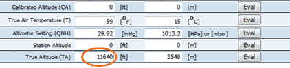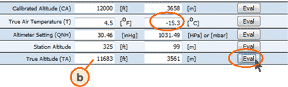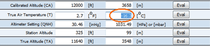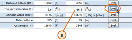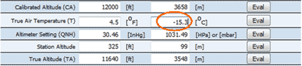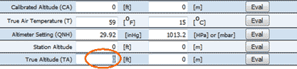 To see what the true altitude (TA) is, press "Eval" on the true altitude field. The result is 11683 ft with the one degree warmer temperature. We know from before that the true altitude when the temperature was -16.3 oC is 11640 ft. Therefore now at -15.3 oC, it is 43 ft higher. This is consistent with our expectations that if the temperature increases 1 oC, so will the true altitude increase.