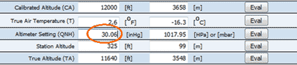 To find what the true altitude (TA) is, pressed the "Eval" button. The result is 11671 ft (d). Therefore, at this new altimeter setting of 30.06 inHg the true altitude (TA) increased from 11640 ft to 11671 which is equal to a 31ft difference. This seems to contradict the saying "from high to low, hot to cold, look out below" because when the pressure decreased by 0.40 inHg the true altitude rose 31 ft. What happened is that in this example we are under the assumption that the pilot correctly enters the new altimeter setting as the pressure decreases, and in doing so will be at a higher true altitude while flying the exact same calibrated (or indicated) altitude of 12000 ft. What the saying is really trying to imply is that the pilot would be flying much lower if the pressure decreased and at the same time the pilot did not get the new updated altimeter setting, and was flying the old altimeter setting for the previous higher pressure.