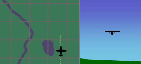 Figure 2-1 shows our hypothetical aircraft flying straight and level. The left image is the top map view, and the image on the right represents the aircraft as seen from behind.
