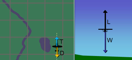 Figure 2-2 on the left shows the thrust (T) and drag (D) forces. Since the aircraft's true air speed (TAS) will remain constant during straight and level flight and then subsequently during the execution of the standard rate turn in our hypothetical example, we are not going to concern ourselves with these forces. Also note that thrust (T) and drag (D) will cancel each other out both before and during the turn, but they will not remain the same. During the turn, drag (D) will increase due to the need to generate more lift; as a result more thrust (T), added by the pilot, will be necessary to compensate for this increase in drag. This thrust increase is necessary if airspeed is to remain constant. We will examine why lift has to increase in more detail shortly.