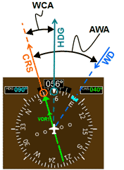 Figure 4 illustrates how a heading bug can be used on a heading indicator to remind the pilot where the wind is coming from. In this case the wind direction (WD) is from 090. If the course (CRS) that is going to be navigated is 040, for example, the pilot can visualize the 040 mark on the heading indicator to be that course. In this case wind is coming from the front (headwind), therefore the angle between the course (CRS) and the wind (WD) will be the acute wind angle (AWA). If the wind were a tail wind the AWA would be the angle between the reciprocal of the course (CRS+180) and the wind direction (WD).