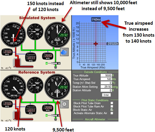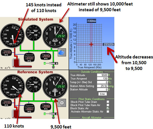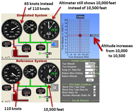 In the following scenarios the airspeeds will be rounded to the nearest 5 knots for convenience. We will be using the Pitot static system simulator available here on our site to run them. The simulator is setup like the Pitot-static system in most general aviation airplanes and is similar to the one described in chart 2-1. The transponder is not depicted here for simplicity, but the transponder would have the same behavior as the altimeter when set for pressure altitude 29.92 inHg. The simulator will have a "Simulated System" and a "Reference System". The "Reference System", which is not affected by the blockage scenarios, is used to compare the blockage scenarios we apply in the "Simulated System".