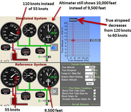 If the pilot were to instead reduce the airspeed, perhaps not realizing the problem, the aircraft could slow down too much and stall or spin. Here (Fig 4-5) we have the pilot slowing the aircraft down until the indicated airspeed shows 110 knots (which was the original indication at the time of the blockage). You can use chart 2-3 to verify this with the pressure difference 21.11 - 20.58 = 0.53 inHg. Looking at the reference system we can see that the aircraft is actually at 55 knots indicated airspeed which could be dangerously slow. Chart 2-3 can once again be used to verify this with the pressure difference (qc = PT - P): 21.11 - 20.98 = 0.13 inHg. Here, a mere 500 feet below the altitude at which the blockage occurred causes the indicated airspeed to be 110 - 55 = 55 knots less than what it should be, or half in this case!