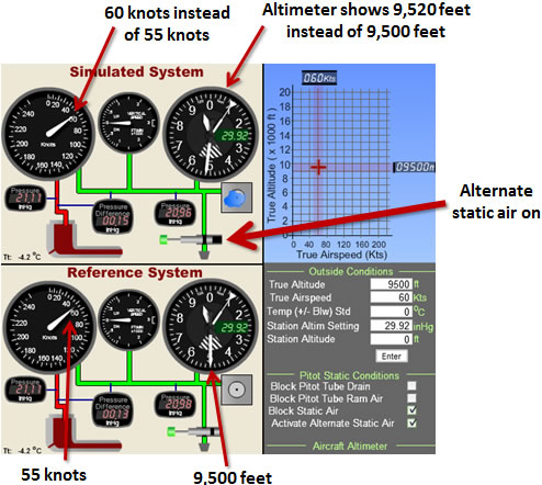 All this time the altimeter and vertical speed indicator were frozen. If a pilot realizes that there is something wrong and suspects an issue with the static port he/she can activate the alternate static air (Fig 4-6) and get the instruments to work again. There may be a slight difference in reading since the placement of the alternate static air port may cause its pressure to be slightly different than an unobstructed static port. In this our example we will suppose the static port gives a very slightly lower pressure. The indicated airspeed is now 60 knots. Chart 2-3 can again be used to verify this with the pressure difference: 21.11 - 20.98 = 0.15 inHg. This is only 5 knots higher than the airspeed shown in the reference system which is much better than the 55 knot difference the pilot experience before. The aircraft's altimeter is also working and showing 9520 feet (only a 20 foot difference from the altitude in the reference system). The vertical speed indicator would also be working again.