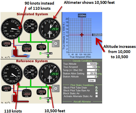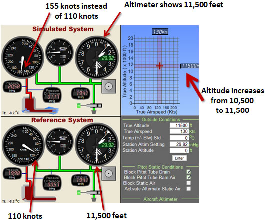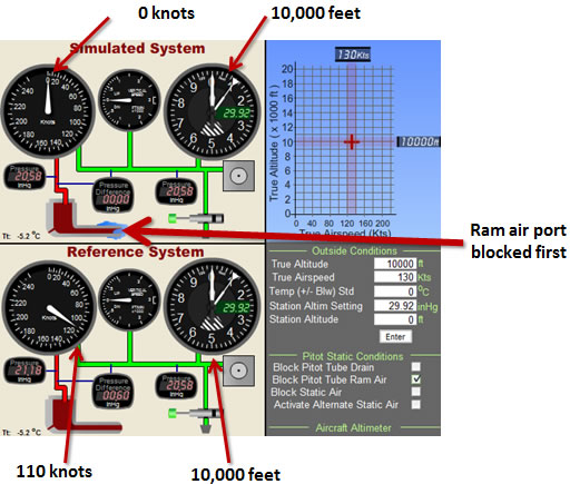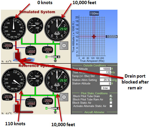 As the aircraft flies at 10,000 feet and 130 knots true airspeed, the ram air port gets blocked. When this happens the indicated airspeed will drop to zero. This is due to the pressure inside the Pitot tube chamber equalizing with the outside air through the drain opening. Now the difference in pressure between the Pitot tube chamber (20.58 inHg) and the static air line (20.58 inHg) is zero inHg which corresponds to zero indicated airspeed (see chart 2-3).