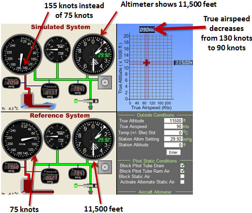 Here the aircraft maintains altitude and decreases the true airspeed from 130 knots to 90 knots. Since the ram air is blocked, airspeed has no influence in the airspeed indication which remains at 155 knots. This indication will only change if there is a change in altitude. Note the difference in pressure remains exactly the same at 1.17 inHg.