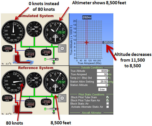 2b. Ram air blocked first and then Pitot tube drain blocked; static port drain remains unobstructed.