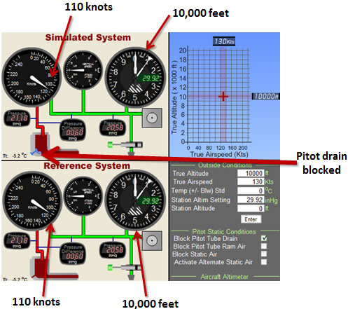 At 10,000 feet and at a true airspeed of 130 knots (which corresponds to 110 knots of indicated airspeed in this case) only the Pitot Pitot tube drain is blocked (Fig 4-30). There should be no effect on the instruments since the Pitot tube drain is too small to affect the pressure of the ram air significantly in the Pitot tube chamber.