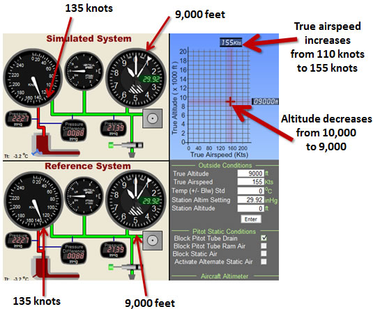 The aircraft then increases airspeed to 155 knots true airspeed (corresponding to 135 knots) and descends to 9000 feet (Fig 4-31). In both the simulated system and the reference system the indications by the instruments are the same. In other words if only the Pitot tube drain in the Pitot tube is blocked there is no effect on the instruments. Note the pressure of 22.27 inHg which is the ram air pressure sensed by the airspeed indicator is not altered by that drain obstruction. In addition, the vertical speed indicator and altimeter are not connected to the Pitot tube where the drain is located and therefore cannot be affected. The vertical speed indicator and altimeter are only affected by static port blockages since they rely on static air.