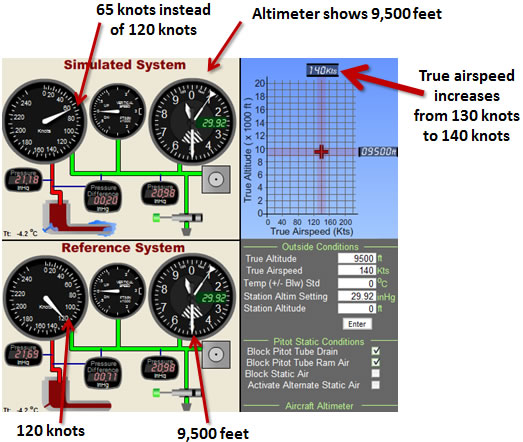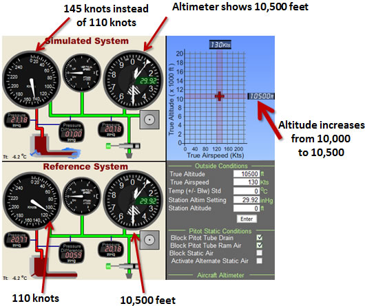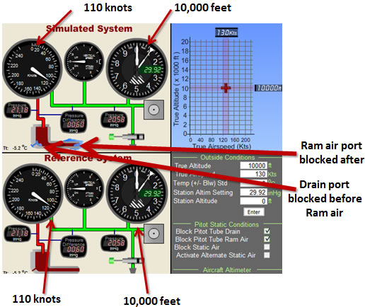 Suppose an aircraft is flying at 10,000 feet and is at a true airspeed of 130 knots. The Pitot tube drain then becomes blocked, followed by the ram air port (Fig 4-32). Since the static port remains unobstructed, there is no effect in either the VSI or altimeter. If the aircraft maintains altitude the pilot will not notice any changes in the airspeed indicator even if airspeed changes the airspeed. In this situation, because the air in the Pitot tube chamber is trapped, the pressure (21.18 inHg) will remain the same in this chamber regardless of any airspeed for altitude change. Since the airspeed indicator measures the difference in pressure between the air in this chamber and the static air line, the airspeed indicator will now move when altitude changes because the static pressure will change with altitude.