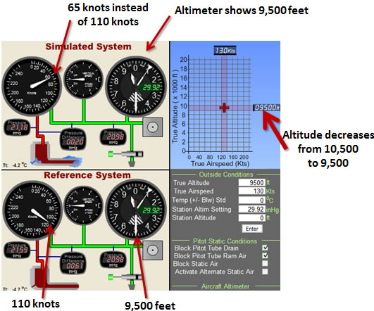 Here we have the aircraft descending from 10,500 to 9,500 feet (Fig 4-34). As expected, the indicated airspeed decreases. It is said that in this type of blockage situation the airspeed indicator will have an altimeter like behavior. In other words the indication will rise if the altitude increases and will lower if the altitude decreases. Notice that the difference between the air pressure in the Pitot tube chamber (21.18 inHg) and the static air line (20.98inHg) which is now greater, is 0.20 inHg. 65 knots (see chart 2-3) is the indicated airspeed that corresponds to that difference in pressure. Here the altitude of 500 feet below the altitude at which the blockage occurred produces a difference of 45 knots (once again, assuming that true airspeed of the aircraft has not changed, which it hasn't in this example). One of the dangers here is that the pilot sees a decrease in airspeed, pushes the yoke even more forward causing the aircraft to descend more which makes the indication of the airspeed indicator decrease further. The aircraft can easily overspeed, lose control or crash in the terrain below if the pilot does not recognise the problem.