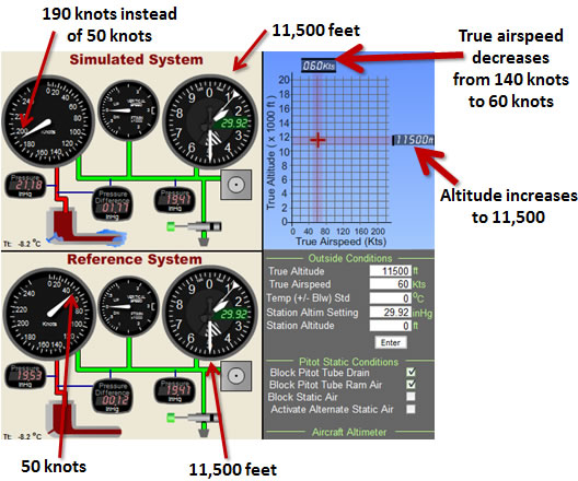 Here in figure 3-36 we have what may happen if the pilot were to pull back on the yoke (causing a climb) in attempt to slow down the aircraft. The true airspeed could slow down to 60 knots as the aircraft climbs to 11,500 feet while the pilot would see an indication of 190 knots instead of the correct indication (see reference system) of 50 knots. The 190 knots (see chart 2-3) corresponds to the difference in pressure of 1.77 inHg between the Pitot tube chamber (21.18 inHg) and the static air line (19.41 inHg).