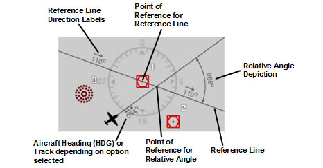Relative to Acft Track: draws a line from the aircraft in the direction of its track. If that line intersects the reference line an angle symbol and a label displaying the relative angle in degrees between the two lines will be displayed.