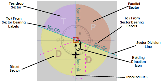 The holding pattern template is available to assist entry and execution of the holding patterns. Labels with inbound course and sectors are also displayed in this template.