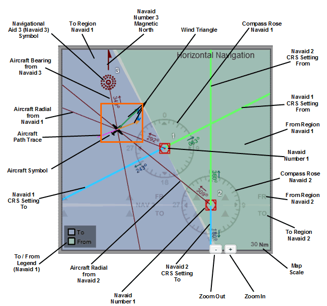 Used as an aid to show the orientation of the Horizontal Navigation panel. It serves the same purpose as the compass rose symbol on IFR en route charts to show direction in relation to the magnetic north. |