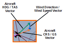 Shows the vectors that make up the wind triangle. It shows the green (heading and true airspeed) plus the blue (wind direction and wind speed) resulting in the orange (course and ground speed) vectors.