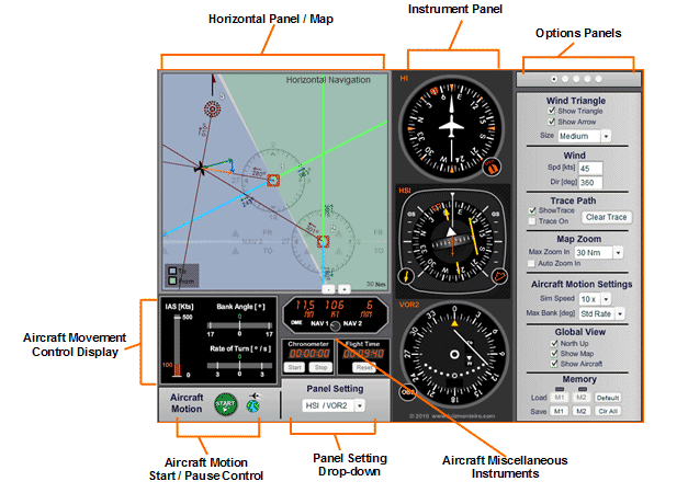 Choose your instruments from the "Panel Setting" drop-down menu. Drag aircraft on map to change the aircraft's position in relation to the facility. If North Up is selected aircraft heading changes can be set by positioning the cursor close to the aircraft on the map then clicking the button when a "-" or "+" appears. If Heading Up is selected, aircraft heading changes can be set by positioning the cursor close to the navigational facility on the map then clicking the button when a "-" or "+" appears.