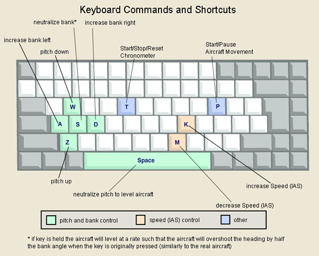 IMPORTANT KEYBOARD CONTROL NOTE: The simulator start button must be pressed and the aircraft rotating-arround-the-globe icon must be moving for the keyboard commands to work. In addition, if clicking outside the simulator (like clicking on the browser scroll bar, text or any other area outside) the browser may stop sending the keyboard commands to the simulator. You must click on any blank portion of the simulator to allow the browser to transfer keyboard commands to it. You can also still drag and reposition the aircraft even if it is moving.