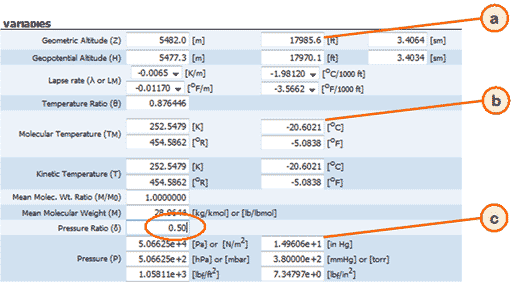 The pressure ratio is the ratio between air pressure at a certain altitude and the sea level pressure. The ratio for the pressure to be half, or 50%, will be 0.50. Lets select the pressure ratio field and highlight it with the mouse.